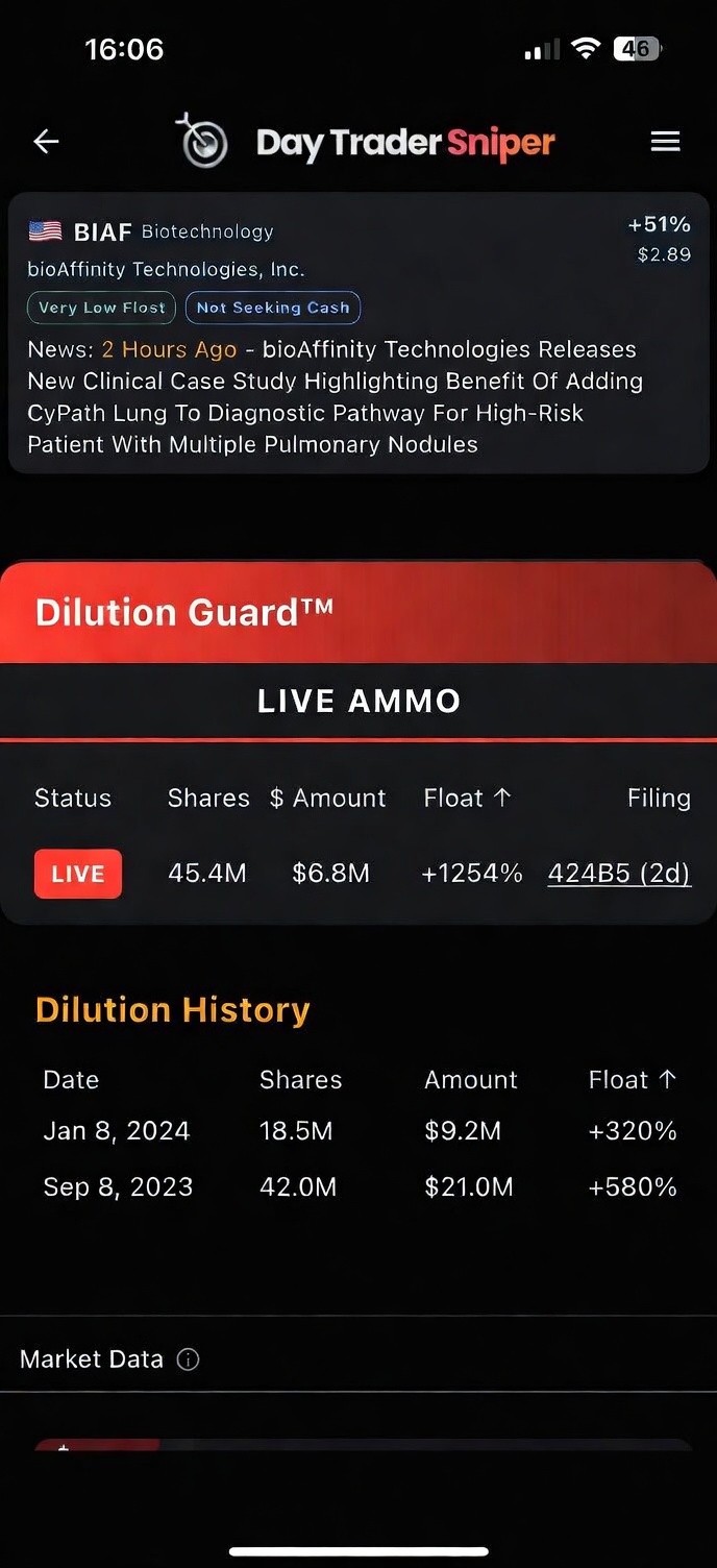 Before you enter, check the Catalyst page. Dilution Guard shows every live dilution risk the company holds right now — the positions that can be sold against you the moment you buy.