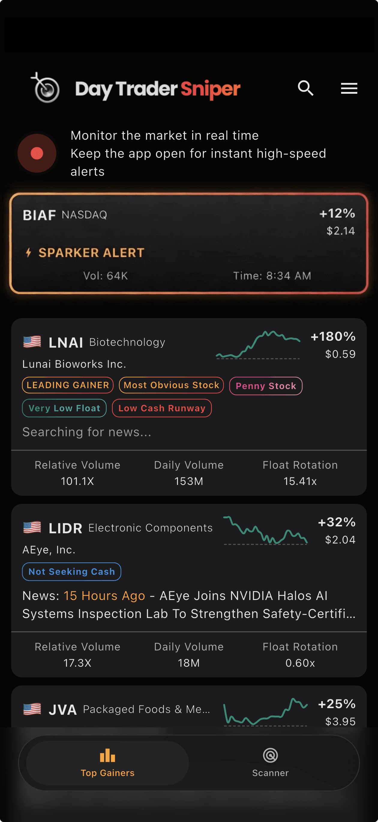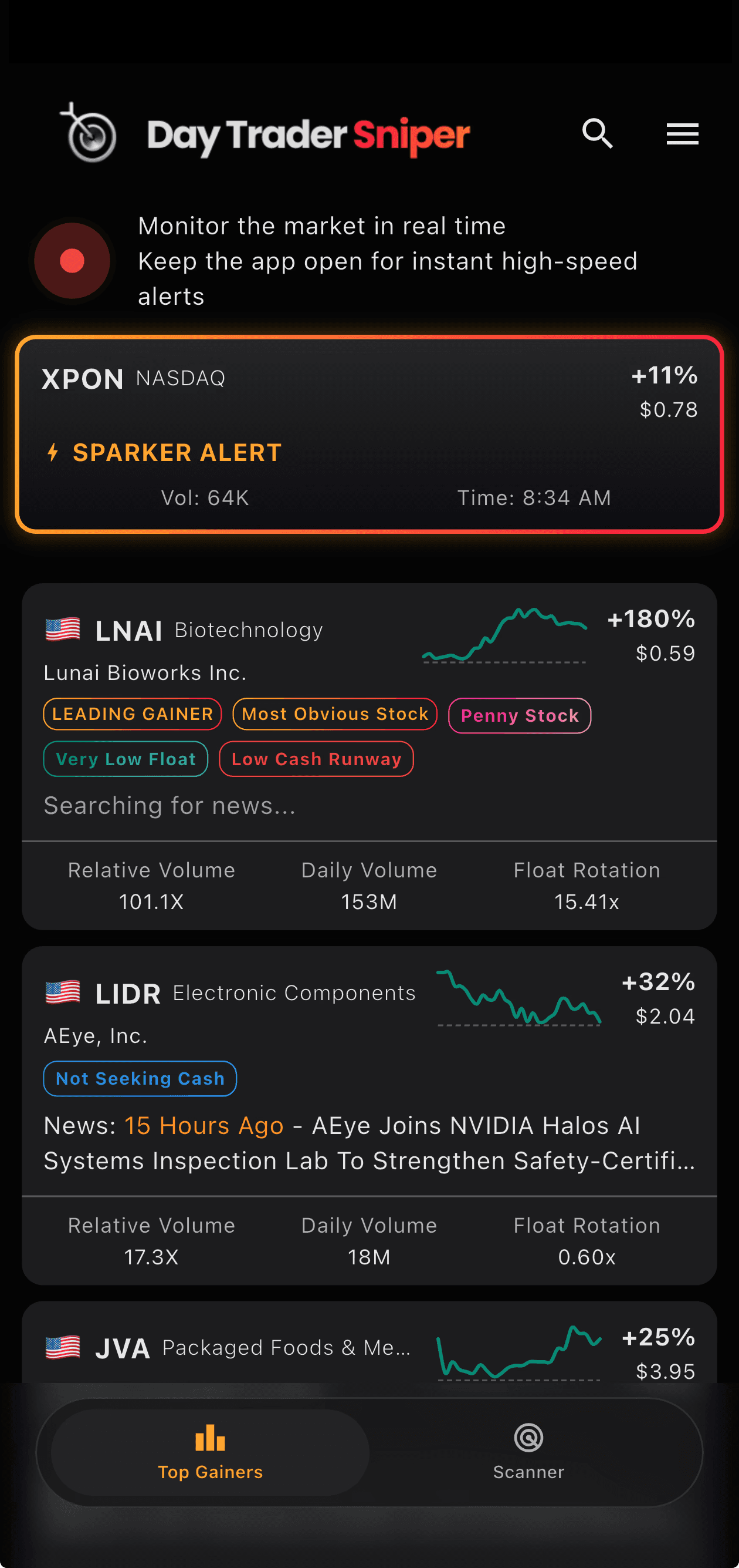 Sparker Alert detects the moment a ticker ignites. The first price spike, before volume confirms — delivered to you in real time so you can act before the move is priced in.
